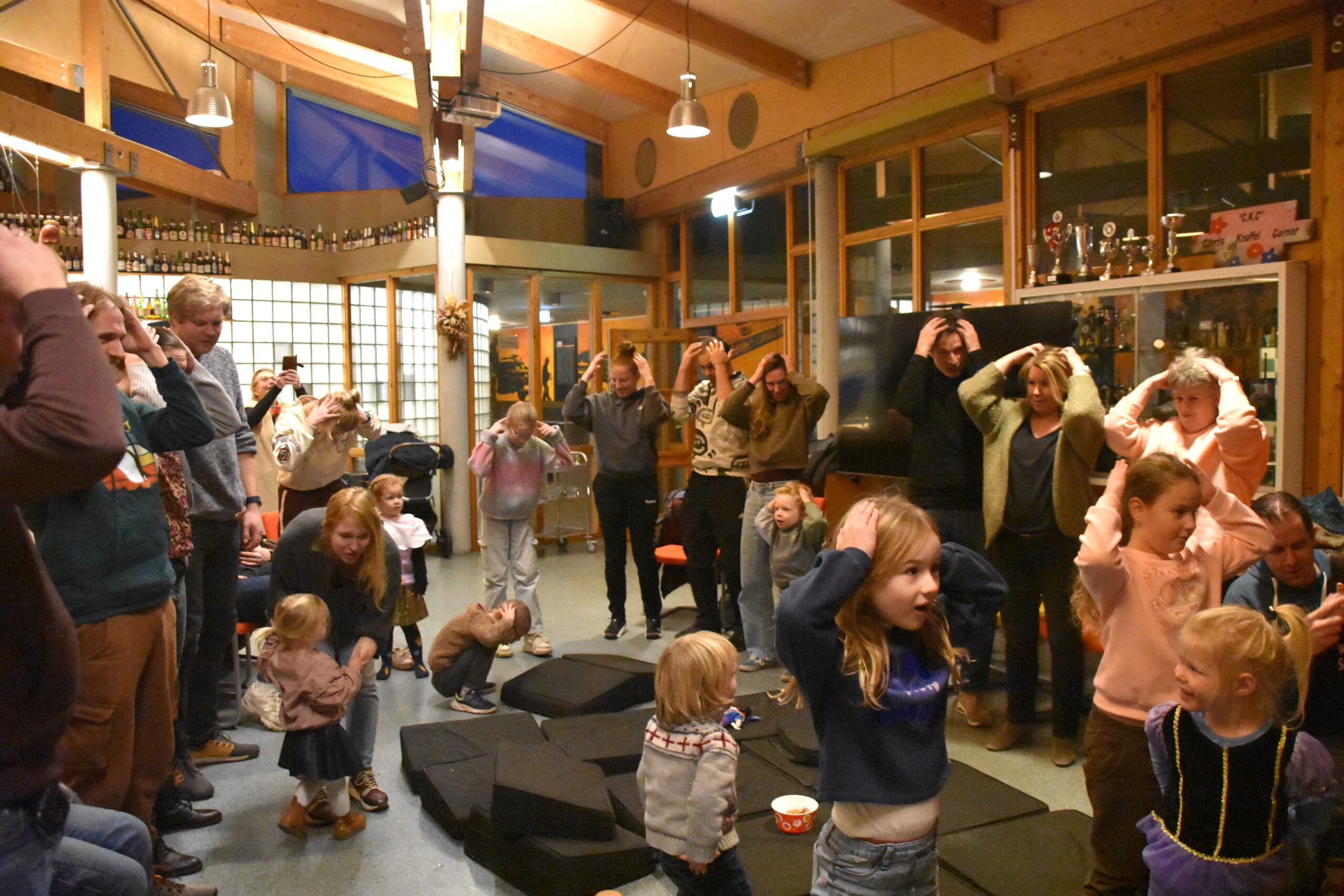 Binnen werden Sinterklaas en zijn Pieten met gezang ontvangen. Nadat de Sint had verteld over zijn letterlijk stormachtige aankomst op Texel en de kinderen nog wat hadden gezongen en samen met de ouders een spelletje hadden gespeeld, mochten de kinderen stuk voor stuk bij de Sint komen voor het ,functioneringsgesprekje’.