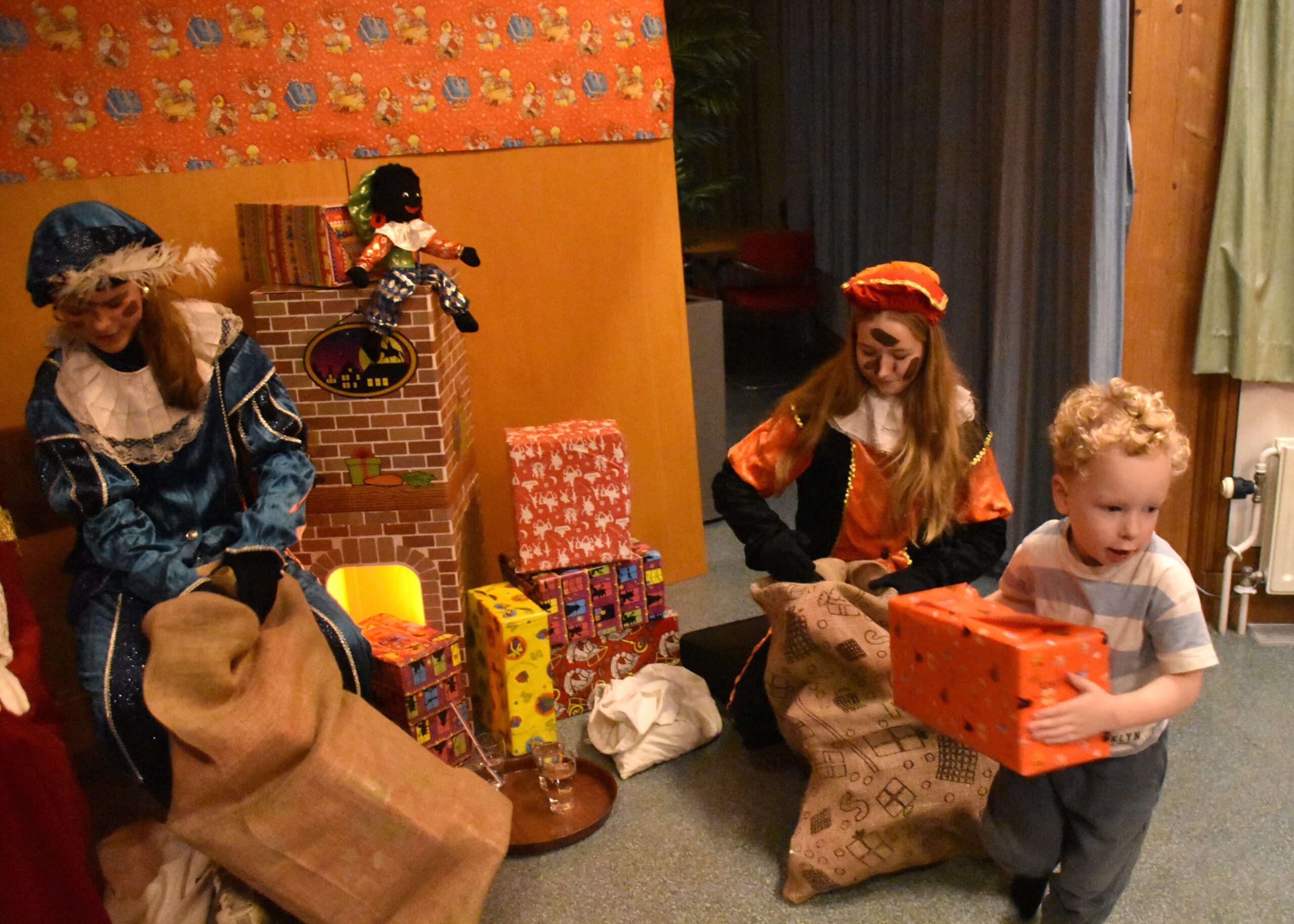 Daarna was het ogenblik aangebroken waarop de kinderen hadden gewacht: het uitdelen van de cadeautjes. De Pieten zorgden ervoor dat de pakjes goed terechtkwamen.